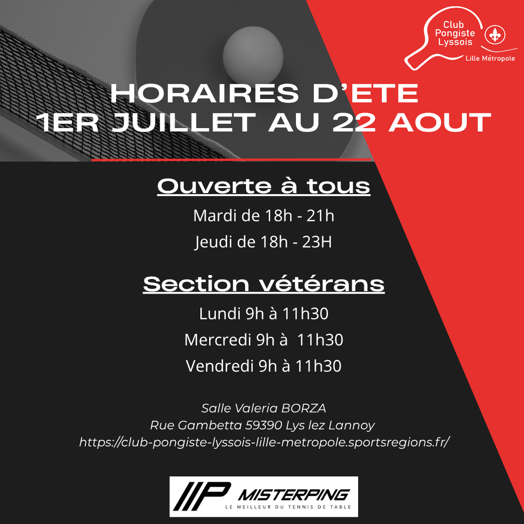 Horaires d'ouverture de la Salle Valéria Borza Allée Jules Ferry, 59390 Lys-Lez-Lannoy Club Pongiste Lyssois Lille Métropole Période : du 01/07 au 22/08
